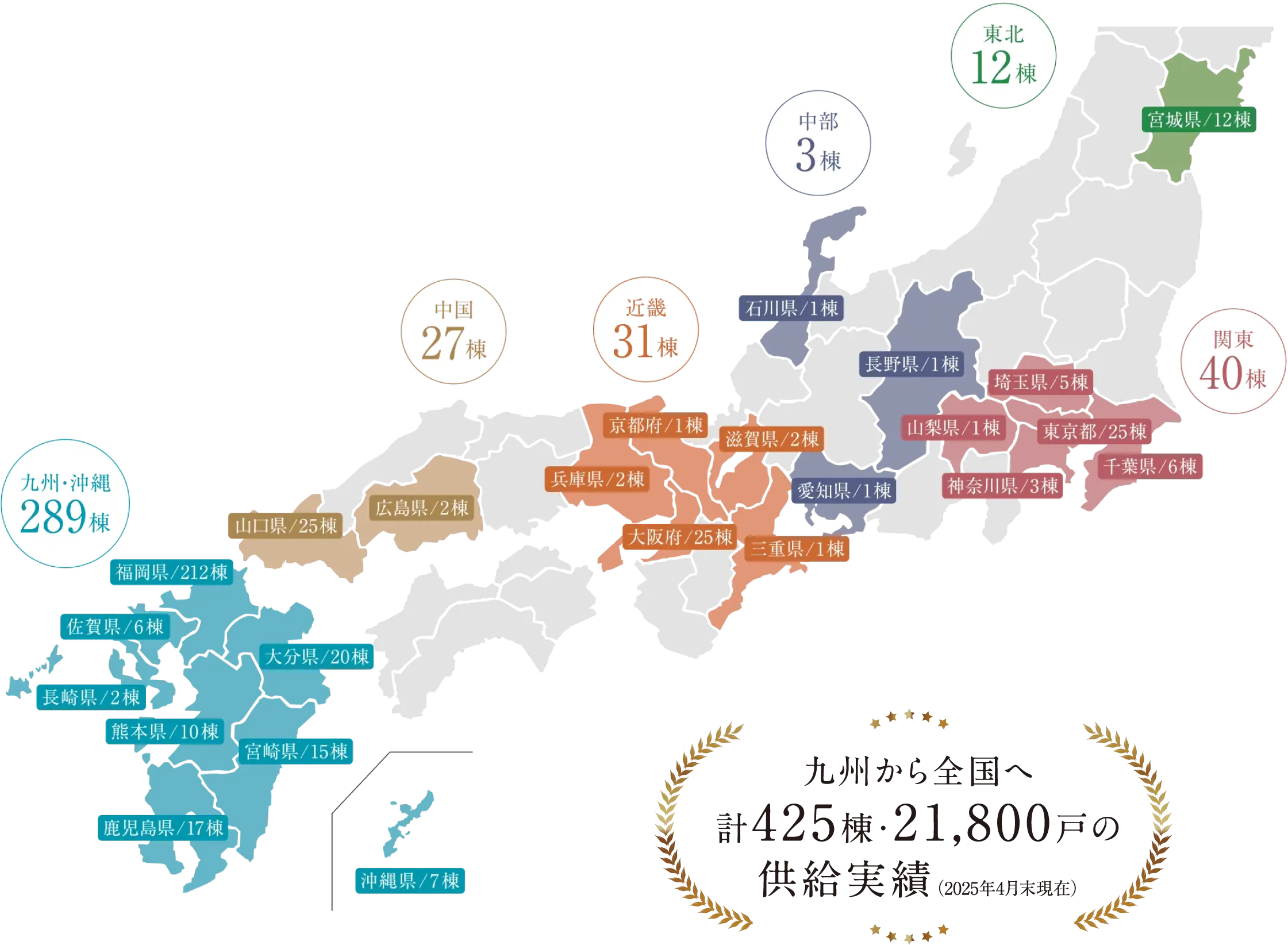 北九州・福岡をメインに、東京、埼玉、千葉、神奈川、山梨、長野、石川、宮城、大阪、兵庫、京都、滋賀、山口、広島、大分、佐賀、 熊本、長崎、宮崎、鹿児島、沖縄に進出し、その供給実績は既販売分を含めると400棟を超えています。