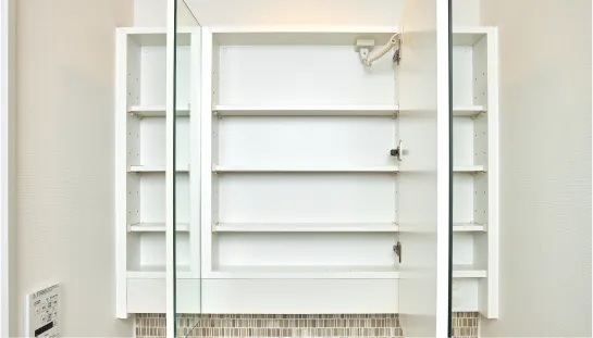 鏡背面に収納スペースを設けているので小物などをスッキリと収納できます。