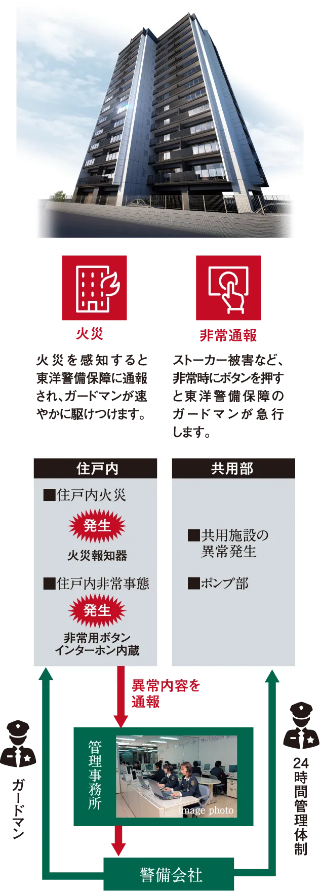 24時間365日体制でマンションライフの安全を監視。 火災、非常用ボタン、エレベーター非常用ボタンなど専有部や共用部の設備異常を感知すると、マンション内の管理室を通じて「東洋警備司令センター」へ異常信号を発信。 いざという時には訓練を受けたガードマン(警備員)が迅速に駆けつけ、適切な対処を行います。