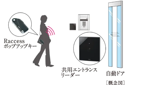 「Raccessポップアップキー」をバッグなどに入れたままで、共用部を解錠できるハンズフリーキーです。